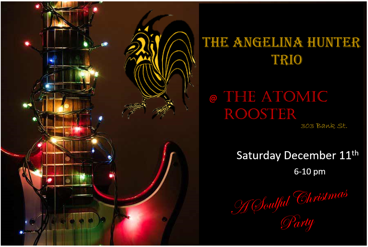 Yes, that’s right, The Rooster is BACK!!!!! Oh yeah! We’re going to bring you one hell of a Soulful Christmas Party on Saturday Dec. 11th 6-10pm. It’s been way way too long, and we just can’t wait to come see you, play some new killer tracks and Ange has been dying to climb up on those tables to play her guitar solos. So come early to snag a table and come enjoy yourselves with us cause I promise you that this will be a Christmas Party for the books…https://www.atomicrooster.ca/